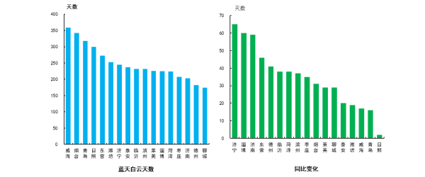 “藍天白云,繁星閃爍”天數最多的城市是威海市,為359天,最少的是聊城市,為174天。同比增加最多的是濟寧市,為65天。