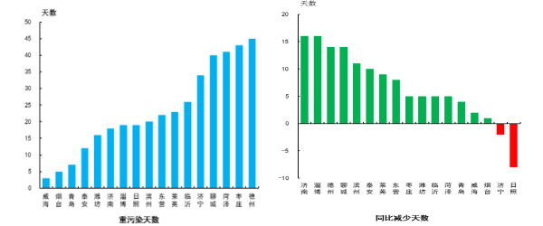 重污染天數出現最少的是威海市,為3天,最多的是德州市,為45天。重污染天數同比減少最多的是濟南和淄博市,為16天;同比增加最多的是日照市,為8天。