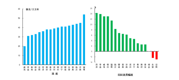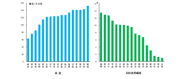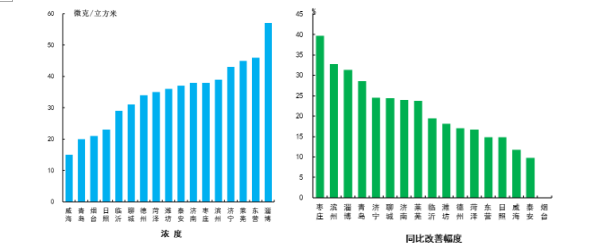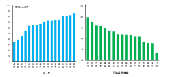 細顆粒物濃度最好的城市是威海市,為35μg/m3,最差的城市是聊城市,為86μg/m3。17市均同比改善,改善幅度最大的是德州市,為19.8%。
